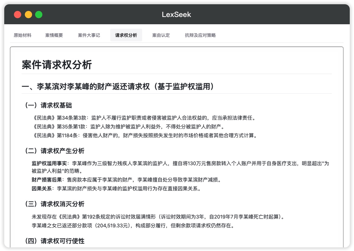根据案情自动生成可能的请求权,并提供详细分析和法律依据,帮助您制定更有力的诉讼策略。