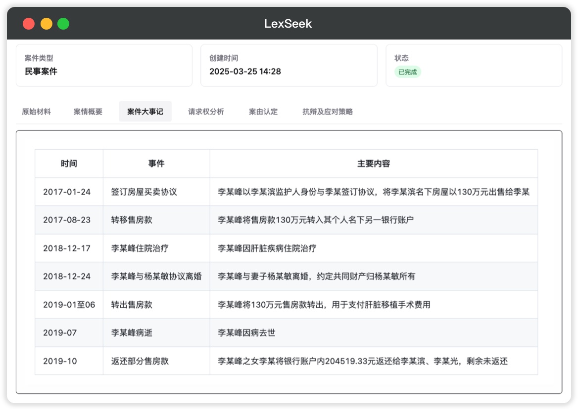 自动整理案件中的重要时间点和事件,按时间顺序呈现关键事件,便于您全面了解案件发展过程。
